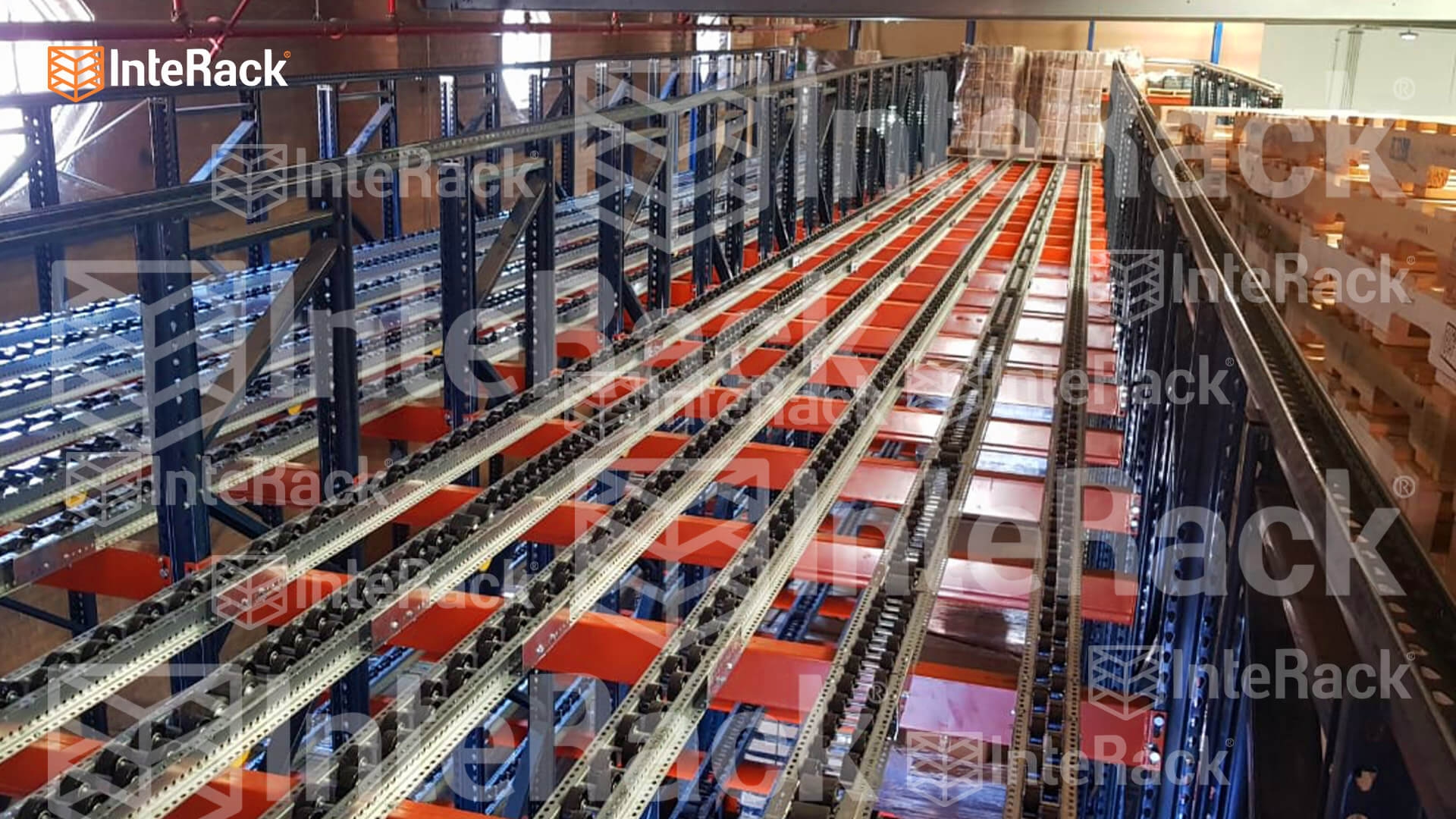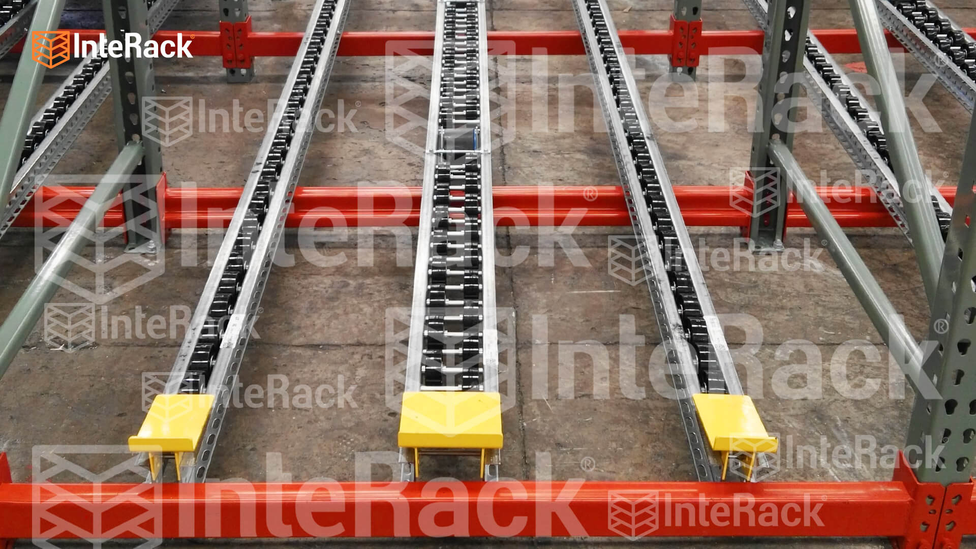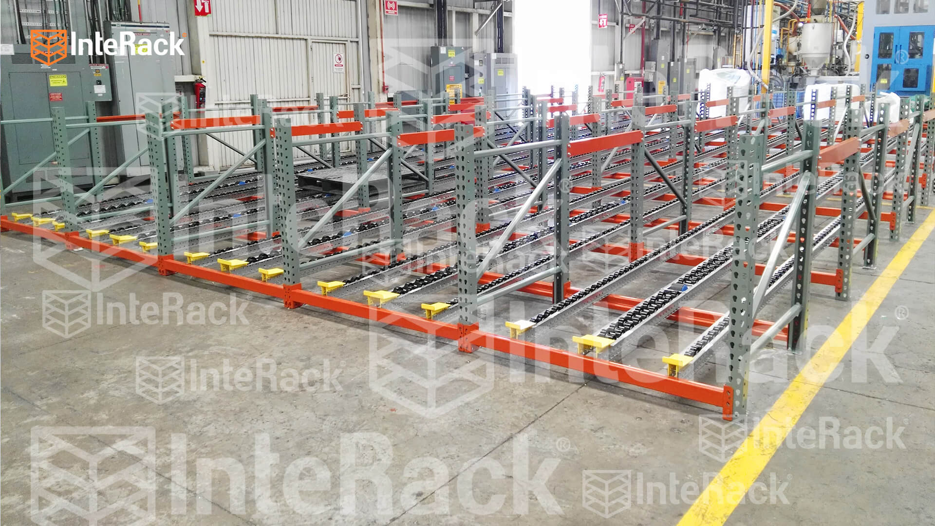 Este sistema de rack dinámico es una solución para la automatización de almacenes, con un flujo de primeras salidas y primeras entradas. Al tratarse de racks con rodillos, las tarimas se cargan por un lado del rack y se deslizan fácilmente al otro, utilizando en su totalidad el espacio de almacenaje disponible.